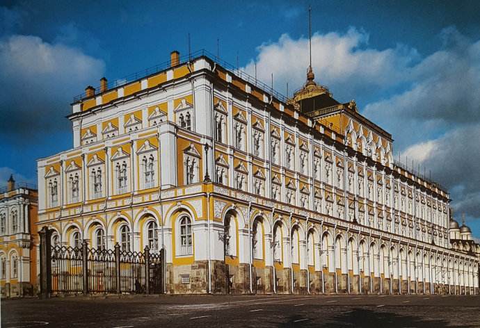 1838年,大克里姆林宮重建,全部由俄羅斯工匠采用本國(guó)建筑材料建成,外表看是三層建筑,實(shí)際是兩層,第一層向前突出,構(gòu)成一個(gè)露天陽(yáng)臺(tái),后來(lái)作為蘇聯(lián)政府、蘇共中央和社會(huì)團(tuán)體舉行會(huì)議的場(chǎng)所。