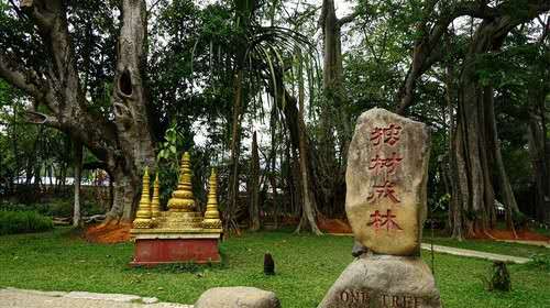 獨(dú)樹成林位于打洛鎮(zhèn)邊境貿(mào)易區(qū)內(nèi)的曼掌寨子旁,距離打洛鎮(zhèn)政府以南3.5公里,靠近中緬邊境的地方。這是一棵古榕樹,有900多年的樹齡,共有34個(gè)根立于地面,樹高50多米,樹幅面積2000多平方米,枝葉既像一道籬笆,又像一道綠色的屏障,成為熱帶雨林中的一大奇觀,打破了“單絲不成線,獨(dú)樹不成林”的俗語。