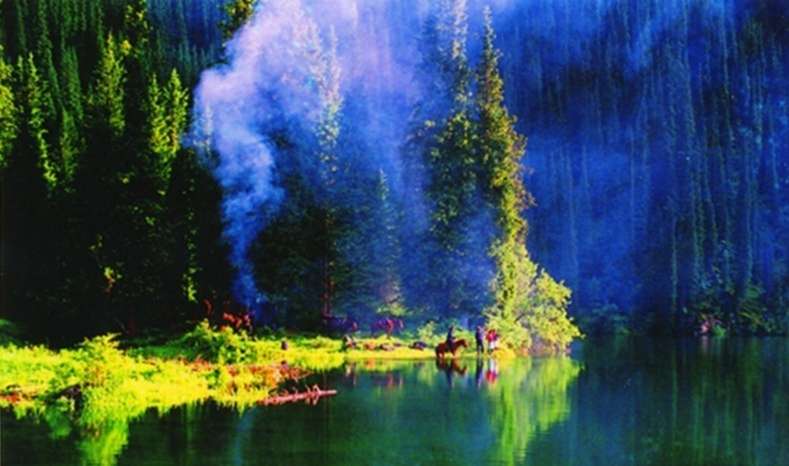 從夏塔古城向南一走到入山口,道路兩邊一個(gè)高過一個(gè)的高大土堆幕鱗次櫛比,向人們展現(xiàn)了烏孫時(shí)期國力的強(qiáng)大與草原文化的具體內(nèi)涵,入山以后,自然景色漸漸秀麗,兩邊茂密的原始森林懸掛在人們視線內(nèi)的半山腰,其中溝的西邊有現(xiàn)代當(dāng)?shù)鼐用窭靡粋€(gè)小山坡半自然地圈養(yǎng)鹿場(chǎng);向南古道迂回攀升,異常險(xiǎn)峻,在短短的一公里范圍內(nèi),相對(duì)高度增加了200多米,在向山上走,前面豁然開朗。