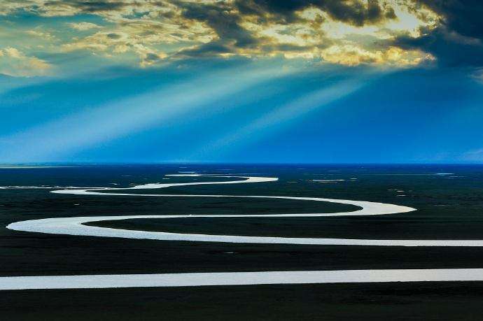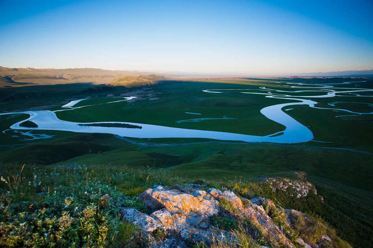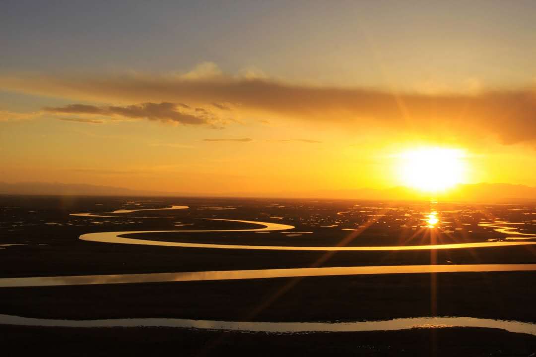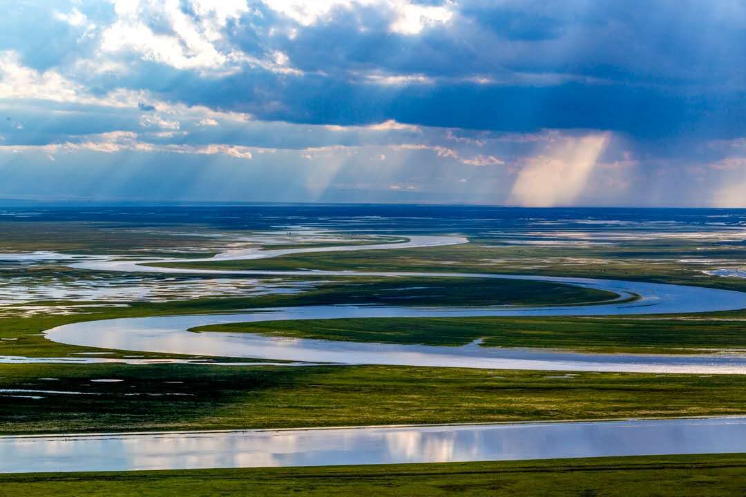 開都河的源頭云霧繚繞,特別是盛夏,云涯水暖,云水難辨,仿佛河水從天而降。開都河上游河流由小尤勒都斯盆地,經(jīng)過巴音布魯克,到大尤勒都斯盆地,水流平緩,河谷開闊,四周牧草豐茂,是天然的優(yōu)良牧場(chǎng)。特別是在小尤勒都斯盆地平坦遼闊的草原上,開都河蜿蜒流淌,形成九曲十八彎的壯麗景象。那模樣,像一個(gè)大寫的蒙古文字,有一種鬼斧神工的靈氣。