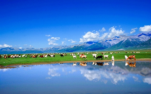 巴音布魯克草原,位于和靜縣西北,天山南麓,面積約2.3萬平方公里,距庫爾勒市636公里,草原上綠草茵茵,牛羊成群,群山拱抱,河流如帶,地勢起伏遼闊,植物種類繁多,是我國第二大草原。古稱鹽場,后改為金沙灘,于2000年舉行沙灘排球比賽一舉成名,位于和碩縣。