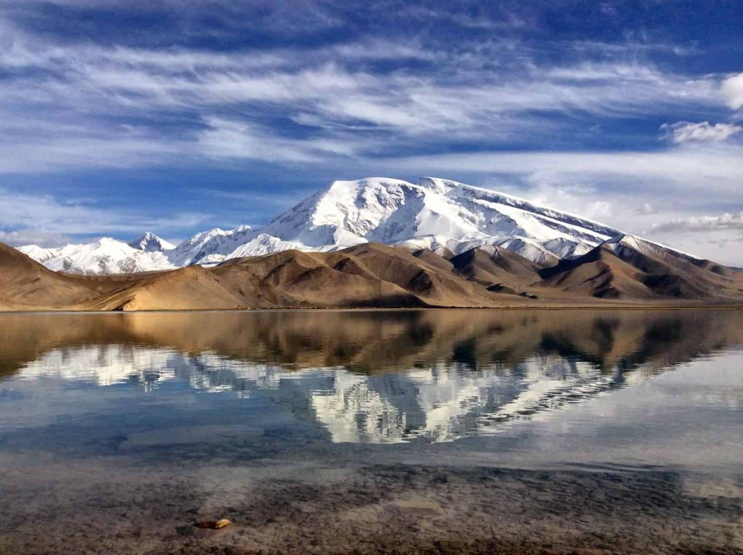 公格爾峰:與慕士塔格峰遙遙相望的是公格爾峰,公格爾九別峰,海拔分別為7649米,7530米,是昆侖山最高峰和次高峰,山頂常年積雪,山間懸掛著條條冰川,猶如飛流直下的銀瀑,又似隨風(fēng)飄逸的素練。