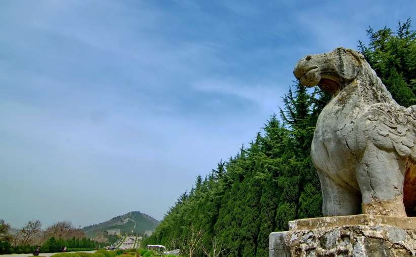 從梁山南二峰的天然雙闕起,往北依次對(duì)稱排列。端立首位的是1對(duì)高達(dá)8米有余的八棱柱石華表,這是帝王陵墓的標(biāo)志,其造型昭示著生命長(zhǎng)存的理念和古代先民對(duì)人類生殖行為的崇拜。接著是一對(duì)昂首挺胸、渾圓壯觀的石刻翼馬,馬身兩翼雕以卷云紋,似有騰飛之勢(shì)。翼馬之北是1對(duì)優(yōu)美的高浮雕鴕鳥,是唐王朝同西域人民文化交流與友好往來(lái)的象征。緊接鴕鳥的是5對(duì)配有馭手的石仗馬和10對(duì)高4米左右的石翁仲(或稱直閣將軍)。