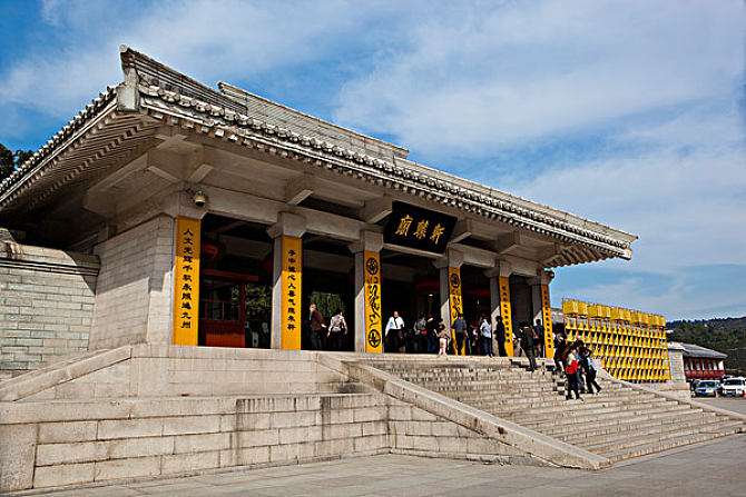 前檐當(dāng)間建有六扇隔扇門,次間、稍間則各有四扇隔扇門。檐下的闌額、平板枋為和璽彩繪、斗拱彩繪,以及兩側(cè)與兩側(cè)背面、內(nèi)梁等處彩繪,均精致華麗,絢爛無比。大殿氣勢雄偉。正殿門楣上懸掛有原國民黨愛國將領(lǐng)程潛于1938年祭陵時所題“人文初祖”四字大匾。字體鐵畫銀鉤,剛中藏秀。大殿正中木質(zhì)壁龕內(nèi)供放著一尊軒轅黃帝全身浮雕像。這尊中華民族人文始祖的浮雕像,是以東漢武梁祠的畫像石刻拓片為藍(lán)本,經(jīng)國家文物局批準(zhǔn),放大刻制而成。版權(quán)所有山東聊城聊之旅國際旅行社有限公司,轉(zhuǎn)載必究!黃帝浮雕像,石料采用陜西富平墨玉,高3.9米,寬3.3米,重11噸。石浮雕像沉穩(wěn)站立,抬臂揚(yáng)手,顯軒轅黃帝雄才大略之氣概;雕像冠帶簡樸,著裝無華,顯示出遠(yuǎn)古之神韻。神龕四周的圖案為:上朱雀,下玄武,左青龍,右白虎。神龕與軒轅黃帝浮雕像都是香港同胞湛兆霖、程萬琦于1987年清明節(jié)專程前來祭陵時,捐款8萬元人民幣制作的。殿內(nèi)兩壁原有壁畫,繪軒轅黃帝一生的功德,后毀于明代。現(xiàn)大殿神龕周圍放置有花籃。神龕前供桌上有祭器、祭品等。殿外左右及背后有磚砌花墻。大殿前月臺寬21.1米,進(jìn)深10.84米,置有香爐、香案。月臺前有臺階通道三處,中間臺階正中為一圓形二龍戲珠石雕。正殿前柱子上,書有一副楹聯(lián):“祖功澤百世,宗德潤千秋?!?/span>