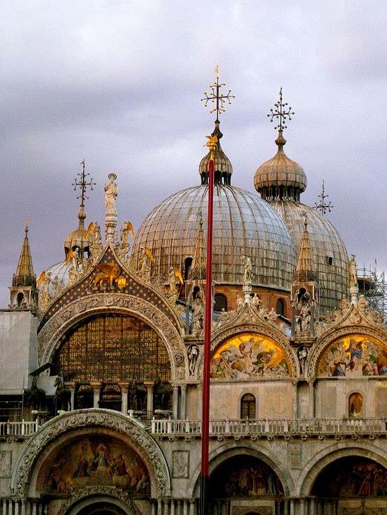 巍峨壯觀的圣馬可大教堂坐落于廣場東邊,圣馬可廣場即由此而得名。教堂始建于公元829年,為千年的古跡瑰寶,值得游客一再走訪。鄰近的總督府原是建于9世紀的防御堡壘,后毀于祝融,現(xiàn)存的外貌始于14至15世紀,其建筑之華麗,充分展現(xiàn)出昔日共和國時期之國威。大運河環(huán)繞該區(qū)而流,在南彎道兩旁府邸林立,乘船游河能遍覽水都風(fēng)華。內(nèi)部的藝術(shù)收藏品來自世界各地的,因為從1075年起,所有從海外返回威尼斯的船只都必須繳交一件珍貴的禮物,用來裝飾這間「圣馬可之家」。