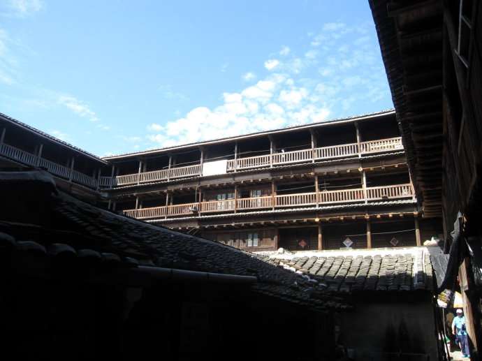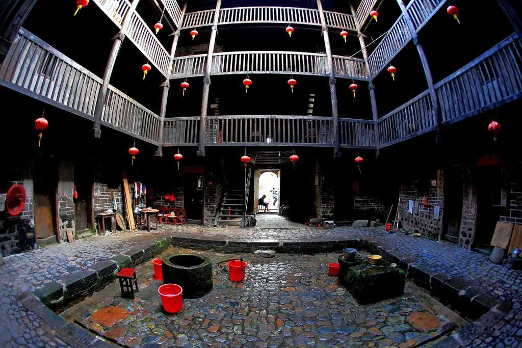 亦有五鳳型,橢圓型,八卦型,永定最多,將近二萬多座。南靖亦有一萬五千多座。永定以客家人為主,南靖為閩南人.土樓內(nèi)有水井和排水,門大多只有一個,多的有3個。房間的窗戶較小。遠處看去就是一個堡壘。門比較結實,大多包了鐵皮,晚上大門一關,非常安全。土樓的中間是祠堂,祠堂有的是獨立的。