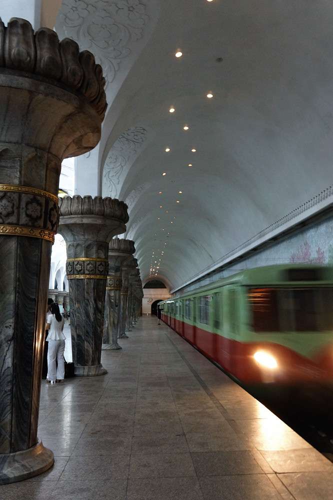 平壤地鐵是在中國的援助下于1968年開始興建的,當(dāng)年北京的地鐵也剛開始動(dòng)工。1973年剛通車時(shí),地鐵采用的部分車廂還是中國長春客車廠的產(chǎn)品??梢哉f,平壤地鐵是中朝友誼的又一個(gè)見證?,F(xiàn)在,平壤市內(nèi)一共有兩條地鐵,呈十字交叉形,貫通全城東西南北,總長40公里,日均客流量達(dá)到40萬人次。