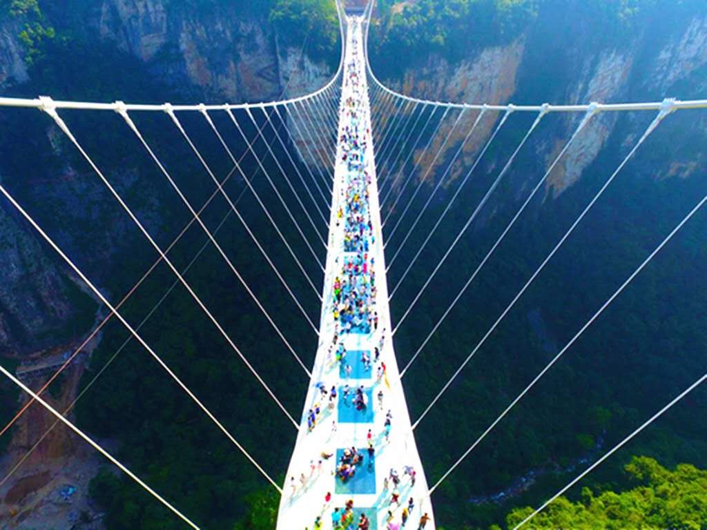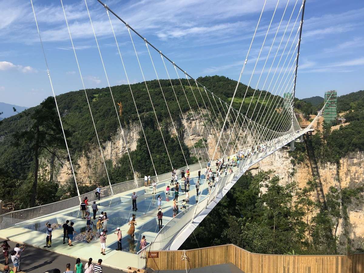云天渡所處地形懸崖溝谷、崗巒起伏、陡峭險峻,場地屬于原始巖溶地貌,地質(zhì)條件復雜。因地處喀斯特地貌區(qū)域,建設者們在前期巖體第三次施工鉆探中發(fā)現(xiàn)玻璃橋一端主塔下方80米深處有溶洞,會嚴重威脅橋梁安全;玻璃橋最終延伸60米,橋面拓寬2.8米,以增強橋的安全系數(shù)。版權所有山東聊城聊之旅國際旅行社有限公司,轉(zhuǎn)載必究!橋梁設計和施建方面,克服建筑選材、玻璃工藝、抗風防滑、抗震減振、抗壓抗凍等多項技術難題, 玻璃采用高強度航天復合材料, 具有大尺寸、高硬度、高厚度、耐磨、防凍、超純凈、防爆、高荷載、防霉、防溫度劇降、脆性玻璃與柔性橋結合等諸多特性。