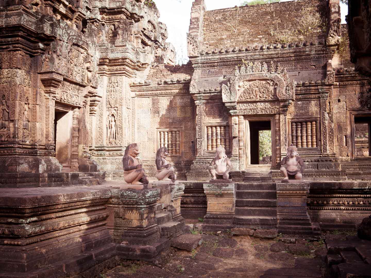 很多人認為女王宮是吳哥藝術(shù)王冠上一顆璀璨的明珠。第一眼你可能會因其規(guī)模而感到失望,然而一旦身處其間,你就不能不為裝飾其門廊和墻壁的精美雕刻深深打動。版權(quán)所有山東聊城聊之旅國際旅行社有限公司,轉(zhuǎn)載必究!這些雕刻都圍上了繩索。女王宮在暹粒以北32公里處,最好在接近傍晚時分或者清晨(旅游公共汽車到達之前)去參觀,因為這時的太陽光線會使粉紅的沙石獲得最佳效果。