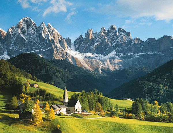 奇峰林立、巍峨莊嚴(yán)的群山屹立于意大利、德國和當(dāng)?shù)乩刂Z (Ladino) 文化的交叉口。此山又名“白山”,這個名字得自于潔白無瑕的白云石,但每至破曉和日落時分,山中萬物都會染上一層粉紅色,接著漸變?yōu)榘导t色—— 這種現(xiàn)象被稱為阿爾卑斯之光 (enrosadira),多洛米蒂因此而聞名于世。布倫塔 (Brenta) 群山位于多洛米蒂山區(qū)最西端,山中坐落著旅游勝地——摩敦納迪-坎皮格里奧 (Madonna di Campiglio)(隸屬于特倫托 (Trento) 地區(qū))。 但據(jù)官方宣傳,多洛米蒂山最迷人的自然風(fēng)光是特倫托東部位于西斯蒙山谷 (Val Cismon) 和費(fèi)耶美-法薩山谷 (Fiemme and Fassa Valleys) 之間的山區(qū)。 再往前走我們可以看到圣馬蒂諾-卡斯特羅扎山,它緊鄰佩爾-圣馬蒂諾山 (Pale di San Martino) 和菲拉-普里梅羅 (Fiera di Primero) 山,坐落于費(fèi)耶美-法薩山谷之中,周圍環(huán)繞著塞拉 (Sella)、薩索倫高 (Sassolungo)、馬爾莫拉達(dá)(Marmolada)、摩埃納 (Moena) 和卡納澤伊 (Canazei) 等眾多山峰。 朝北走,可以看到加爾代納山谷 (Val Gardena),它隸屬于博爾扎諾省 (Bolzano),山谷兩旁依偎著美麗的奧蒂賽依市 (Ortisei) 和迷人的圣克里斯蒂娜市 (Santa Cristina) 與塞爾瓦市 (Selva)。