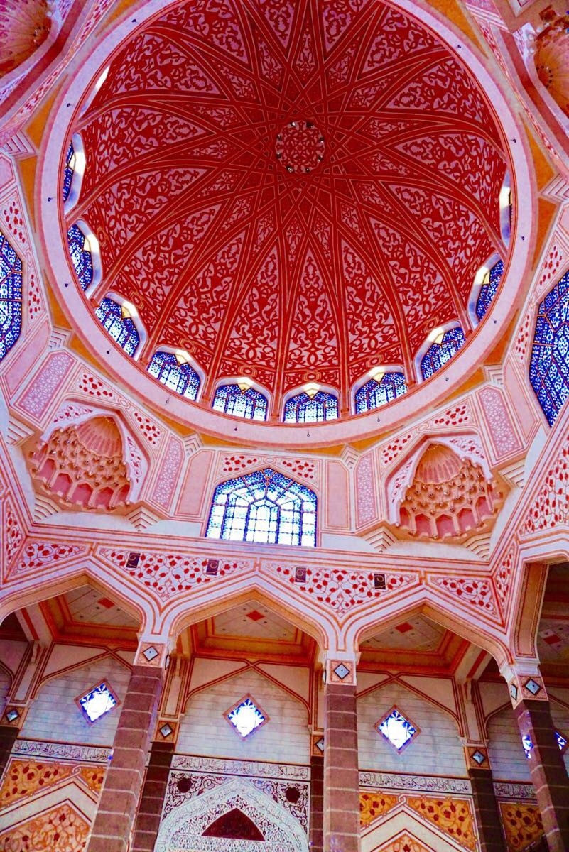 清真寺主體建筑有四分之三建在水上,外觀粉紅色,有異于一般的藍(lán)色或綠色,因此又稱“水上粉紅清真寺”??赏瑫r(shí)容納一萬(wàn)多人做禮拜。它分為上下兩層,二樓供四千名女子專用,樓下為八千男子使用。