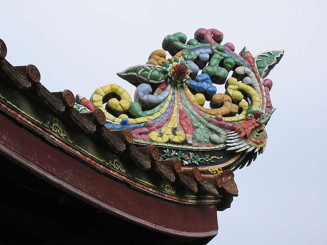 拜庭兩旁古榕參天,大雄寶殿雕塑技術(shù)高超,尤其是粱槽間的24尊飛天樂(lè)伎,在中國(guó)國(guó)內(nèi)古建筑中罕見(jiàn)。殿前月臺(tái)須彌座的72幅獅身人面青石浮雕,殿后廊的兩根古婆羅門(mén)教青石柱,同為明代修殿時(shí)從已毀的元代古印度教寺移來(lái)。大殿內(nèi)用近一百根海棠式巨型石柱支撐殿堂,俗稱"百柱殿",殿內(nèi)供奉的五方佛像,法相莊嚴(yán),是漢地少有的密宗軌制。大雄寶殿之后的甘露戒壇,系中國(guó)現(xiàn)存三大戒壇之一,壇之四周立柱斗拱和鋪?zhàn)鏖g的24尊木雕飛天。