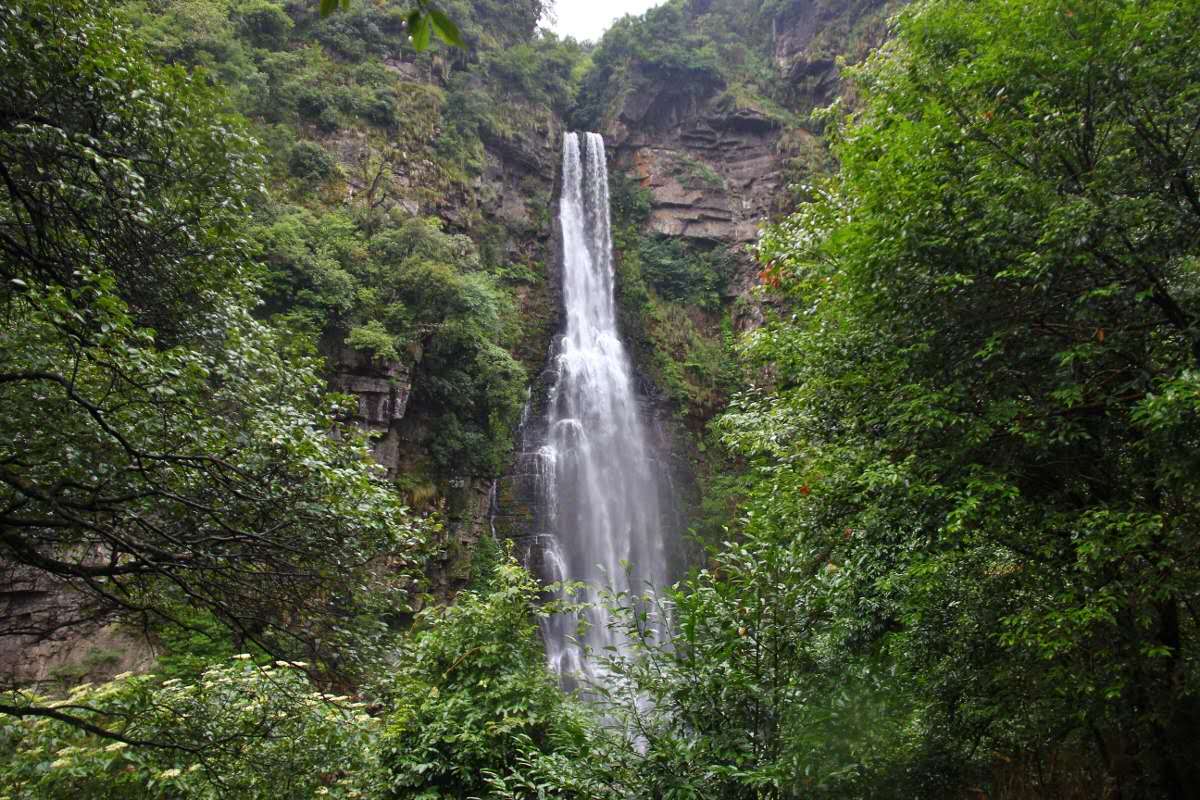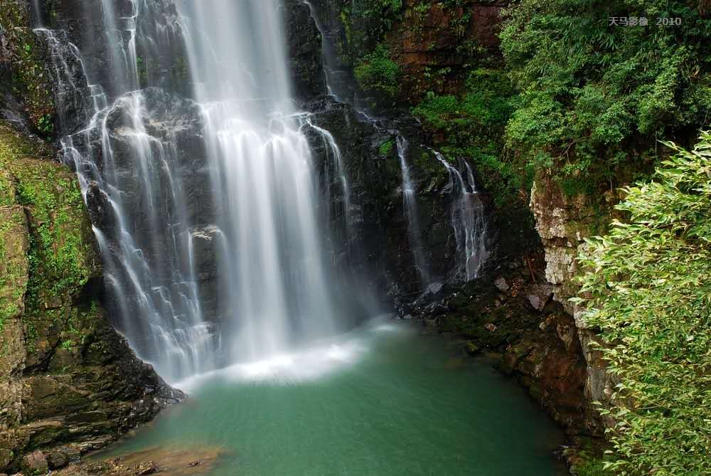 叢林之中,羞藏小家碧玉。碧玉潭的瀑布水從小井山澗五神河溪水飛流直下,猶如一條白練凌空垂掛,噴珠吐玉,氣勢(shì)磅礴。瀑布跌水高近70米,崖壁中段褶皺,酷似一觀音坐在蓬花上,在簾中沐??;又似一座觀音坐蓮,側(cè)左身雙手捧著凈水瓶將甘露灑向人間。這是井岡山最壯觀的瀑布之一。