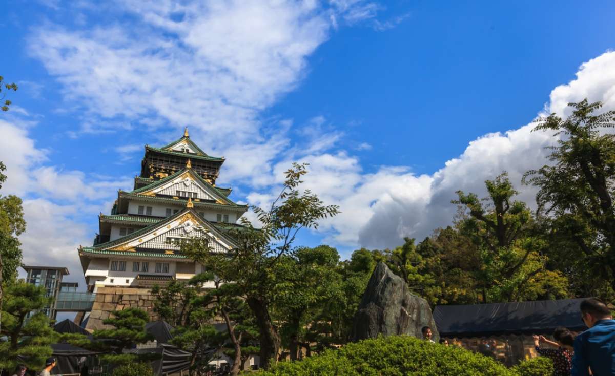 歷史悠久的大阪城,系豐臣秀吉于1586年所建,是由雄偉的石墻砌造而成,大阪城公園內(nèi)城中央聳立著大阪城的主體建筑天守閣,巍峨宏偉,鑲銅鍍金,十分壯觀。登上高五層八階的天守閣,可以瞭望整個大阪市。如今大阪城已被定為特別史跡。城內(nèi)的歷史博物館里保存有豐臣秀吉的木像、武器和美術(shù)作品等。在西之丸庭園,有一片寬闊的草原和曾遭祝融燒毀并再度重建的外堀、太平門等古跡,是散步休閑的好去處?,F(xiàn)存的大阪城公園于1931年由民間集資重建,為后人仿制豐臣秀吉時期的天守閣重制的,大阪城外觀5層,內(nèi)部8層,高54.8米,7層以下為資料館,8層為瞭望臺,并且有一些紀(jì)念品出售。城墻四周建有護城河,附近有風(fēng)景秀麗的庭園和亭臺樓閣。漫步河邊,奇花異卉,滿目青翠,充滿詩情畫意。城內(nèi)櫻花門頗為著名,當(dāng)年大阪城遭遇火災(zāi),僅這一道全部用巨石砌成的櫻花門屹立無恙,成為僅存的遺跡。