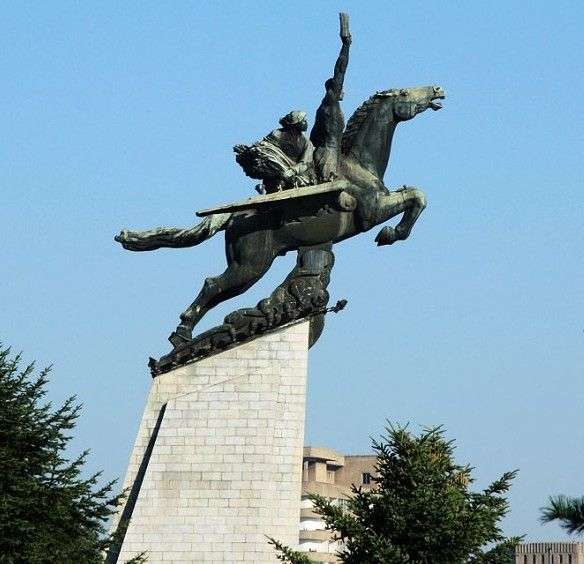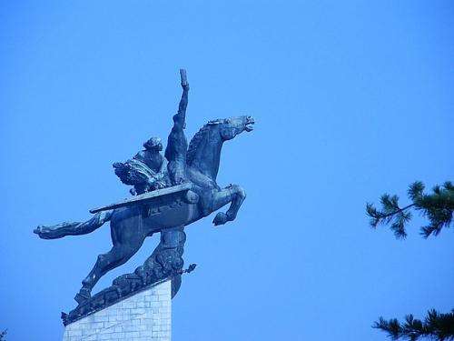 朝鮮千里馬銅像矗立在萬(wàn)壽臺(tái)的丘崗上,是1961年4月 15日,在偉大領(lǐng)袖金日成同志的49壽辰之際建立的。座基是用360多種2,500多塊不同規(guī)格的花崗巖壘起來的,銅像為一匹伸展雙翅的騎有工人、農(nóng)民的 “千里馬”。