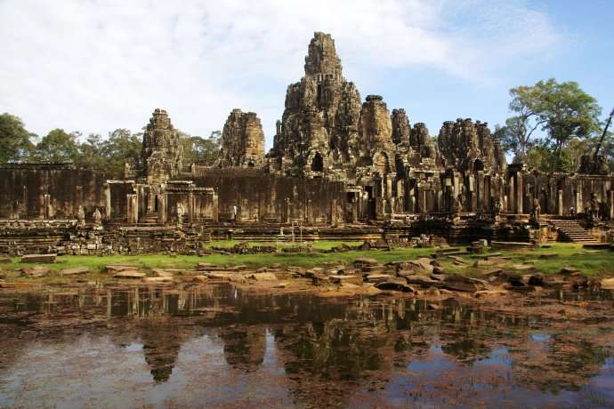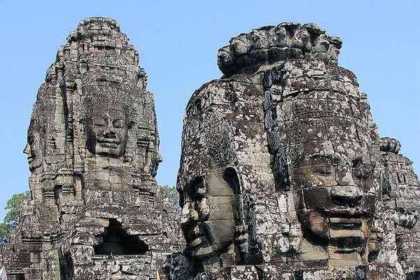 巴戎廟 位于柬埔寨暹粒,吳哥城內(nèi)最為出名的要數(shù)巴戎廟中的佛塔了,巴戎廟位于吳哥城的中心位置,巴戎廟是由一組共49座小寶塔圍繞中央尖塔構(gòu)成的建筑群,這些塔在佛語里又被稱做浮屠,每一座塔的四面都雕刻著巨大的佛面,也正因?yàn)槿绱?,這些塔又被稱作佛面塔,上面的佛被稱為四面佛。
