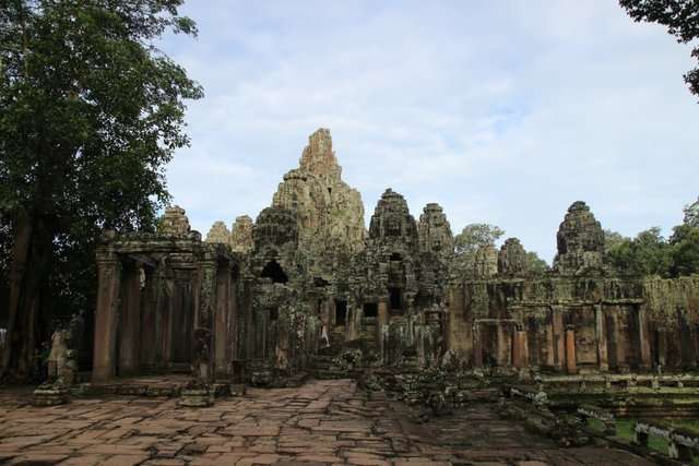 在茂密的叢林中,千回百轉(zhuǎn),灰白的石柱后,一個(gè)又一個(gè)黑白相間的斑駁石塔讓人又重回古代神秘圣土,四面佛那慈祥安定的臉部透出一份寧靜與優(yōu)雅的神秘,拾起記憶的殘片,體會(huì)時(shí)光交錯(cuò)的震撼……