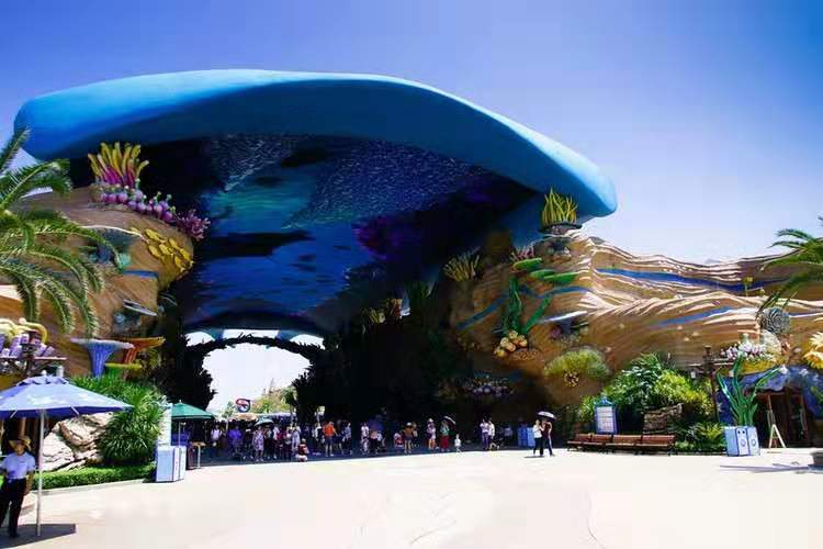 海洋館的流線外型十分獨(dú)特,猶如一顆閃爍異彩的海洋明珠,長(zhǎng)隆海洋王國(guó)的地標(biāo)——高達(dá)63米、約18層樓高的巨型藍(lán)色鯨鯊雕像就矗立在這里,非常震撼。這里是世界最大的海洋魚類展覽館,水體3.1萬(wàn)立方,比目前世界上最大、水體為1.5萬(wàn)立方的水族館水體還超出一倍之多。