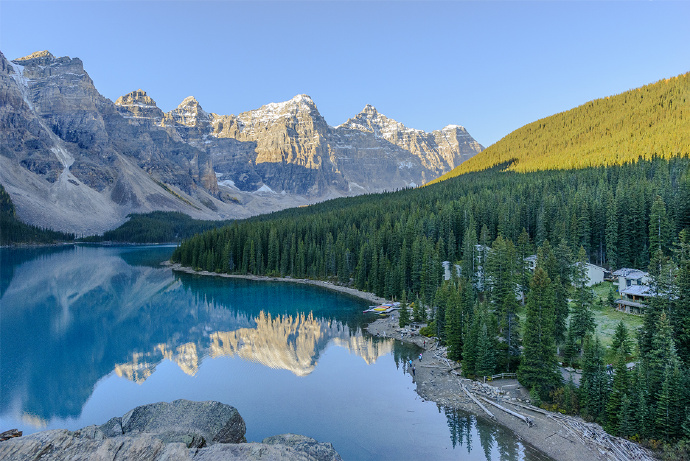 由于夢蓮湖是一個冰川湖,因此只有到每年六月底,湖水才到達最高線,折射沉積的巖粉,呈現(xiàn)出美麗的藍綠色。夢蓮湖被世界公認為是最有拍照身價的湖泊。湖面呈寶石藍色,晶瑩剔透,在鋸齒狀的山谷的擁環(huán)下,就像一塊寶玉。這塊“國寶”被印在加拿大20元的紙幣上。
