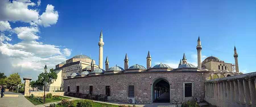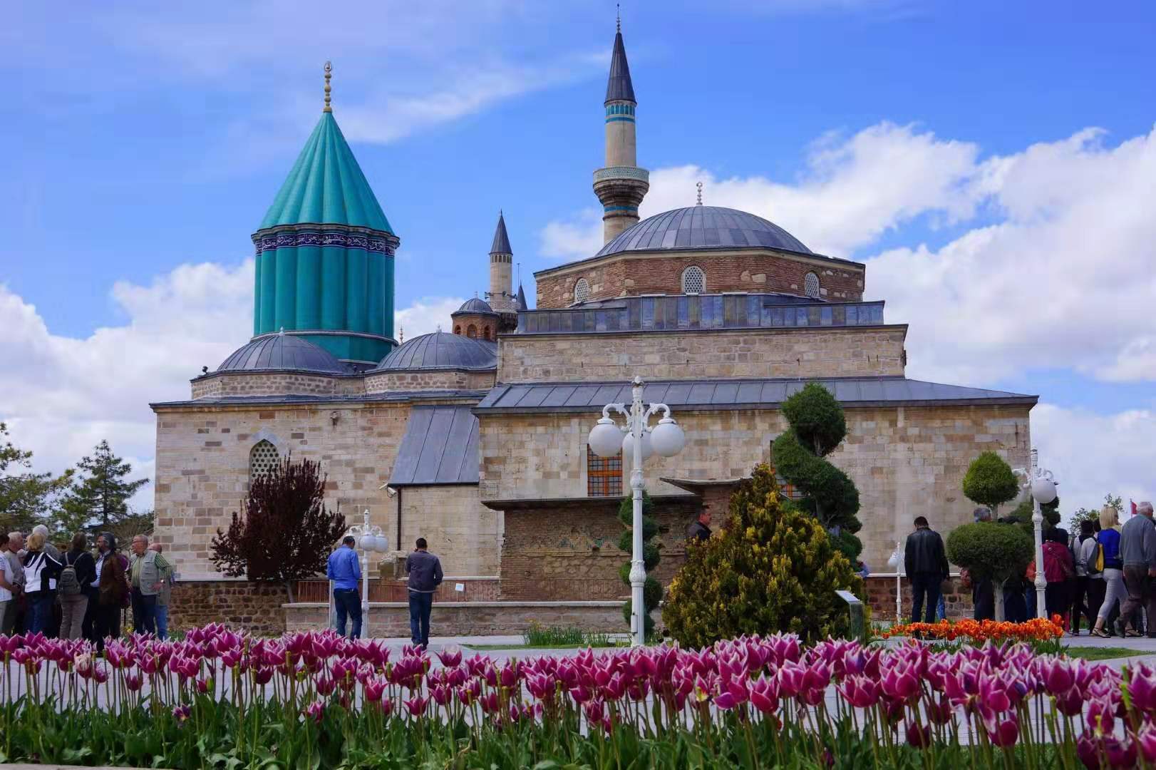 梅烏拉那博物館由清真寺改成,是孔亞人的虔誠圣地,每日前往參拜的當(dāng)?shù)厝耍瑹o不圍繞在梅拉那父子陵墓前念念有辭,用黃金刺繡的絲絨覆蓋著的梅拉那父子,是孔亞人最尊敬的人。而在這龐大的清真寺建筑群中,高高低低蓋碗般的屋頂上,突出一個綠色的高聳尖塔,氣勢非凡。