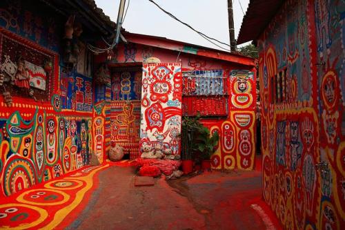 起源于住在臺中市南屯區(qū)嶺東科技大學(xué)附近有一處舊眷村的八十七歲老榮民黃永阜,因為「無聊」而拿起畫筆彩將眷村內(nèi)的巷弄街道當成了天然的畫布,在上頭彩繪了各式美麗的彩虹線條與可愛動物,不僅染亮了小村,在網(wǎng)路上引起熱烈討論,更形成一股參訪風(fēng)潮。黃永阜先生86歲時開始作畫,他用自己手中的畫筆在眷村老舊的房屋和街道上勾勒出一個色彩斑斕的童話世界。老人最初只是在自家的屋里屋外用畫筆描繪心事,打發(fā)時光。后來不少鄰居被他充滿童真的畫所吸引,也邀請他去作畫,就這樣老人在無意中創(chuàng)造了一段色彩繽紛的傳奇。如今,他所居住的位于臺中市春安里的眷村被人們賦予了一個好聽的名字:“彩虹眷村”,并成為了當?shù)氐臒衢T景點,每年吸引約50萬人前來參觀,而香港籍退伍老兵黃永阜則被人們親切地稱為“彩虹爺爺”。走進“彩虹眷村”,地面上、墻壁上畫滿了色彩艷麗、造型俏皮的兔子、小雞、猴子、小鳥、卡通人物、花朵、太陽以及彩虹等。紅色、黃色、藍色、綠色、白色,絢爛的色彩和極富想象力的線條,讓人們馬上置身于童話世界中。村口那條數(shù)十米長的巷道是“彩虹爺爺”作畫最多的地方,也是最熱鬧的地方。這里的畫色調(diào)明艷、熱烈,地上用油漆涂成了紅底,上面用白色和黃色等勾勒出小鳥、小雞和兔子等造型;墻上則分區(qū)塊時而以藍色為背景、時而以白色或黃色為背景,上面畫了數(shù)百卡通造型的猴子、貓和孩童。