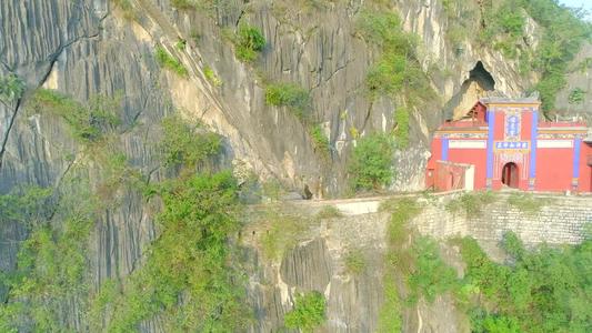 是當(dāng)年蘇元春將息之所。依洞設(shè)景,別有天地。宮門進(jìn)處,洞廳暢明,石刻滿壁?!肮哦撮L春”其左,“奠麗南邦”其右,書藝精湛,分外醒目。左洞上去,是一道朱門,雕龍刻鳳,氣宇軒昂。額題:“玉闕”。對開耳門,號曰“金階”。巨幅壁刻云,“遙通帝座”。沿“金階”上去,見一座金門,稱為“天闕”。左設(shè)左禁門,右置右禁門。洞府正中,一把巨大的石傘之下,數(shù)株石筍,宛若數(shù)名仙女,簇?fù)怼疤斓邸??;厥咨砗?,一道?qiáng)光從高遠(yuǎn)之處,穿山而下,那湛藍(lán)的天穹,恰似一面奪目的寶鏡,陽光就從那里直照到"天帝"的寶座之前。真是奇光天外來,滿洞放異彩。從宮右往“天橋”走去,爬到高遠(yuǎn)的洞口,回身展望,又看到一道彩墻,圖案精美,玲瑰透剔,額題“萬物資始”。自此俯瞰山下,清溪如帶,田垌鋪金,村落點點?!氨T獙m”,結(jié)構(gòu)精美,金門重疊,朱戶畫墻,多彩多姿,真是富麗堂皇,勝似蓬萊。洞頂題詩云,“蜿蜒步上九重天,回首山河數(shù)點煙。如今方識保元妙,幾回夢魂到小連”。美妙的“保元宮”,確令游客駐足留連。