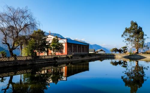 老姆登教堂,青磚墻,紅漆木窗,白鐵皮屋頂,簡單樸素。從外表看,這座教堂并不壯觀,沒有常見的玻璃彩窗、穹頂、和標(biāo)志性的哥特式尖塔,有的只是長條凳和紅漆木窗,但這更顯出人們信仰的純粹和虔誠。每個星期天(周三、周六晚上八點亦有),周邊鄉(xiāng)村的基督教信徒都會集中在這里做禮拜,他們聚集在這里虔誠的念誦贊美詩,對于那些和著太陽和泥土味道的樸實的人民,上帝就住在他們心里,他們像呼吸一樣自然安詳虔誠的哼出那些歌謠。村民唱圣歌是用傈僳語唱的,傈僳族的文字始自圣經(jīng)的翻譯,也為怒族所共用。