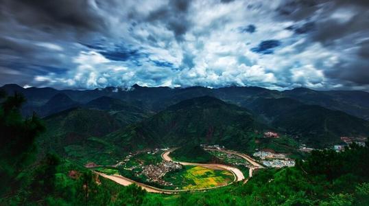 怒江,流經(jīng)云南貢山縣丙中洛鎮(zhèn)日丹村附近,由于王箐大懸?guī)r絕壁的阻隔,江水的流向從由北向南改為由東向西,流出300余米后,又被丹拉大山擋住去路,只好再次調(diào)頭由西向東急轉(zhuǎn),在這里形成了一個半圓形大灣,稱為怒江第一灣。灣中心有一個村子叫坎桶村,這里江面海拔1710余米,氣勢磅礴,灣上怒江臺地平坦開闊,高出怒江500米,構(gòu)成三面環(huán)水的半島狀小平原,小平原四周景物宜人。