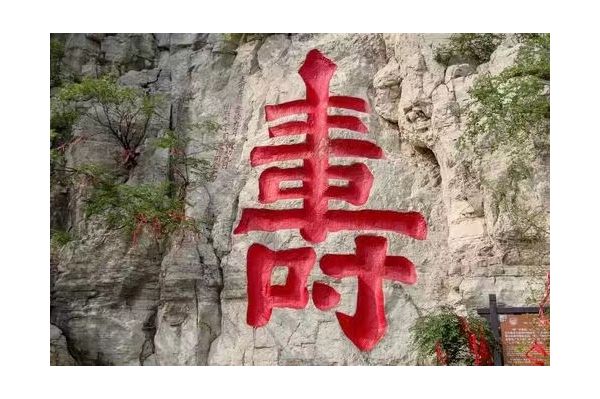 山陰處海內外罕見的巨大鐫刻"壽"字是“壽比南山”典故的出處,該字結構嚴謹,端莊大方,坐南朝北,通高7.5米,寬3.7米,單是下部的"寸"字就高2.22米,為大個頭的漢子所不及,故當地有"壽比南山"、"人無寸高"之說。這個"壽"字是明嘉靖年間衡王府內掌司冀陽周全所獻書。端詳此"壽",字體揮灑俊逸,筆劃圓泣流暢,雖千鑿百斧雕成,卻不露分毫痕跡,充分體現了勞動人民的聰明智慧,是書法石刻藝術的瑰寶。自此,青州官民,朝野上下,去云門山拜壽的人絡繹不絕,已有400余年的歷史了。眾從的中外游客都把能到云門山參拜大壽字作為自己最大的心愿。