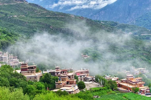 “甲居”,藏語(yǔ)是百戶(hù)人家之意。藏寨從大金河谷層層向上攀緣,一直伸延到卡帕瑪群峰腳下,整個(gè)山寨依著起伏的山勢(shì)迤邐連綿,在相對(duì)高差近千米的山坡上,一幢幢藏式樓房灑落在綠樹(shù)叢中?;蛐橇_棋布,或稠密集中,或在高山懸崖上,或在河壩綠茵間,不時(shí)炊煙裊裊、煙云繚繞,與充滿(mǎn)靈氣的山谷、清澈的溪流、皚皚的雪峰一起,將田園牧歌式的畫(huà)卷展示在人們眼前,以一種藝術(shù)品的形態(tài)存在。2005年由《中國(guó)國(guó)家地理》雜志組織的選美中國(guó)活動(dòng)中,以甲居藏寨為代表的“丹巴藏寨”被評(píng)為“中國(guó)最美的六大鄉(xiāng)村古鎮(zhèn)”之首。