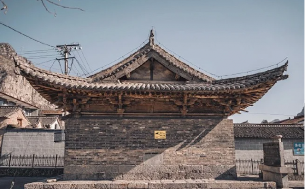 殿坐北朝南,面寬三間,進(jìn)深六椽,單檐歇山頂,布筒板瓦屋面。明間前后辟板門,柱頭斗栱四鋪?zhàn)鲉纬瓎蜗掳海撼逝袷?。梁架為徹上露明造,大梁兩端直接搭在柱頭斗栱上,平槫垂直施卷云駝峰,上置隔架栱,至平梁瓜柱。