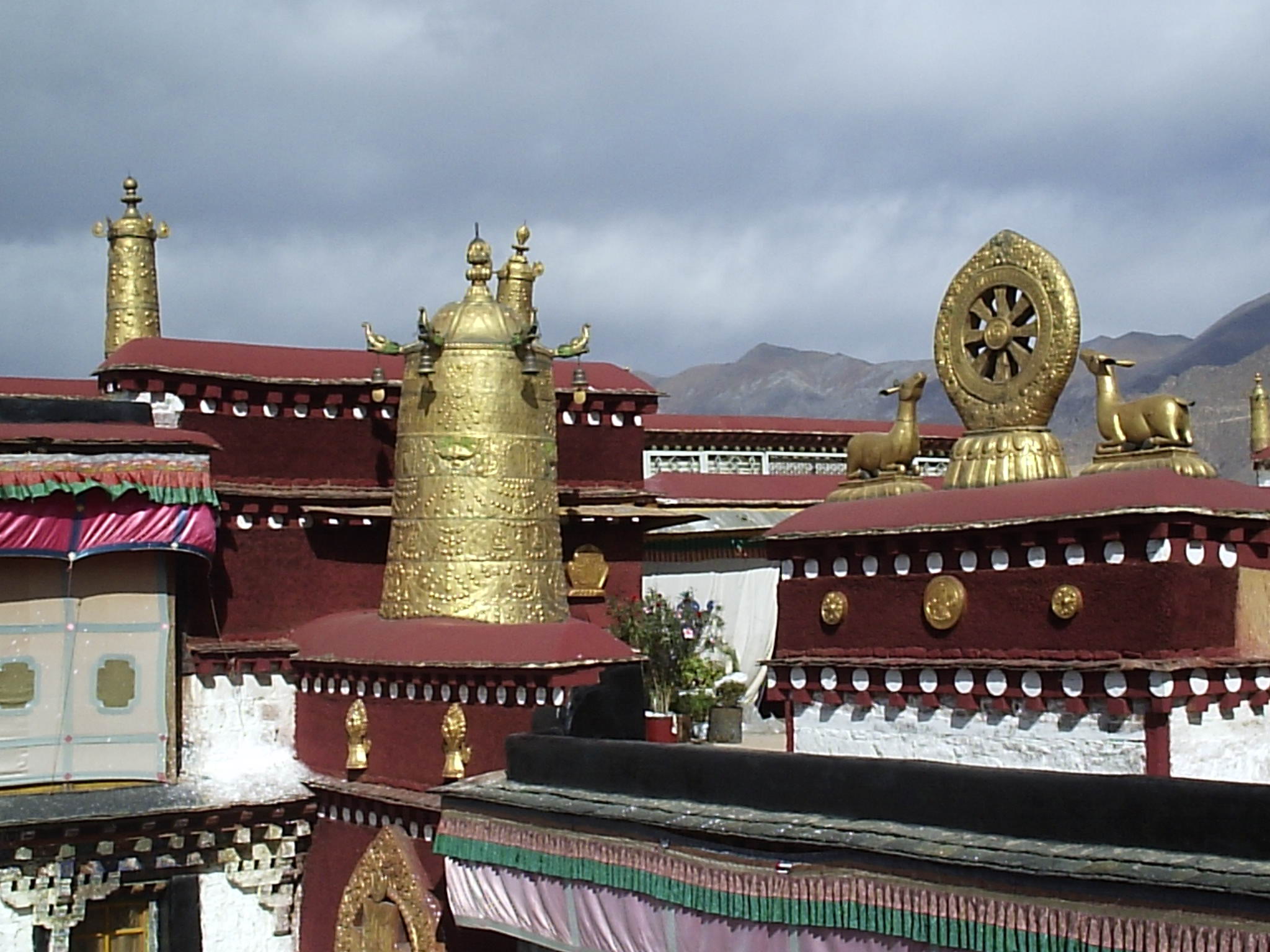從大昭寺金頂俯瞰大昭寺廣場(chǎng),右邊遠(yuǎn)處山上是布達(dá)拉宮,近處的柳樹(shù)是“公主柳”,相傳是文成公主所栽。大昭寺的布局方位與漢地佛教的寺院不同,其主殿是坐東面西的。主殿高四層,兩側(cè)列有配殿,布局結(jié)構(gòu)上再現(xiàn)了佛教中曼陀羅壇城的宇宙理想模式。寺院內(nèi)的佛殿主要有釋迦牟尼殿、宗喀巴大師殿、松贊干布殿、班旦拉姆殿(格魯派的護(hù)法神)、神羊熱姆杰姆殿、藏王殿等等。寺內(nèi)各種木雕、壁畫(huà)精美絕倫,空氣中彌漫著酥油香氣,藏民們神情虔誠(chéng)地參拜轉(zhuǎn)經(jīng)。