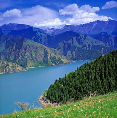 新疆天山天池風景名勝區(qū)以高山湖泊為中心,雪峰倒映,云杉環(huán)擁,碧水似鏡,風光如畫。