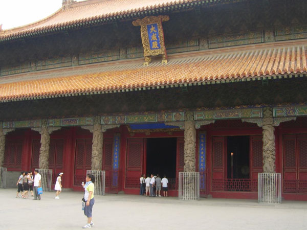 洙水橋北,先是一座綠瓦三楹的高臺大門——擋墓門,后面就到了供奉孔子木主的享殿。去享殿的甬道旁,有四對石雕,名曰華表、文豹、角端、翁仲。華表系墓前的石柱,又稱望柱;文豹,形象似豹,腋下噴火,溫順善良,用以守墓;角端,也是一種想象的怪獸,傳說日行1萬8千里,通四方語言,明外方幽遠(yuǎn)之事;翁仲,石人像,傳為秦代驍將,威震邊塞,后為對稱,雕文、武兩像,均稱翁仲,用以守墓。兩對石獸為宋宣和年間所刻,翁仲是清雍正年間刻制的,文者執(zhí)笏,武者按劍。甬道正面是享殿,殿廣5間,黃瓦 歇山頂,前后廊式木架,檐下用重昂五踩斗栱。殿內(nèi)現(xiàn)存清帝弘歷手書“謁孔林酹酒碑”,中有“教澤垂千古,泰山終未頹”等詩句。解放戰(zhàn)爭時,朱德總司令曾在此殿內(nèi)召開過軍事會議。