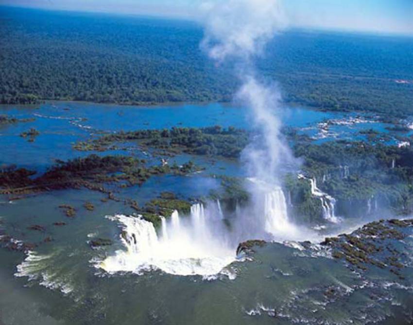 伊瓜蘇大瀑布,亦作Iguassu或Iguazu,西班牙語作Cataratas del Iguazu,葡萄牙語作Cataratas do Iguaçu或Saltos do Iguaçu,平均流量1,751立方米/秒,為馬蹄形瀑布,高82米(269呎),寬4公里(2.5哩),是北美洲尼加拉瀑布寬度的4倍,比非洲的維多利亞瀑布大一些。懸崖邊有無數(shù)樹木叢生的巖石島嶼,使伊瓜蘇河由此跌落時(shí)約分為275股急流或?yàn)a瀑,高度60~82公尺(200~269呎)不等。該瀑布與伊瓜蘇河皆得名于一個(gè)意為「大水」的瓜拉尼語(Guarani) 詞匯。流入伊瓜蘇河。