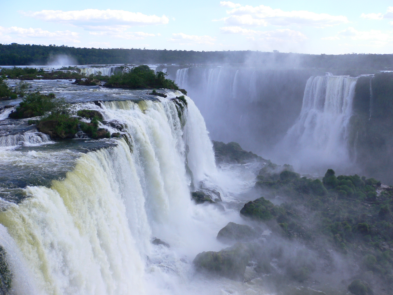 “伊瓜蘇”在南美洲土著居民瓜拉尼人的語言中,是“大水”的意思。發(fā)源于巴西境內(nèi)的伊瓜蘇河在匯入巴拉那河之前,水流漸緩,在阿根廷與巴西邊境,河寬1500米,像一個(gè)湖泊。水往前流陡然遇到一個(gè)峽谷,河水順著倒U形峽谷的頂部和兩邊向下直瀉,凸出的巖石將奔騰而下的河水切割成大大小小270多個(gè)瀑布,形成一個(gè)景象壯觀的半環(huán)形瀑布群,總寬度3000米至4000米,平均落差80米。