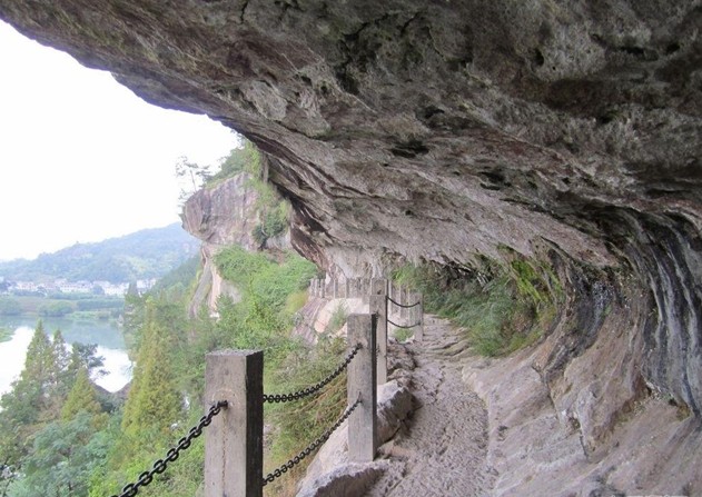 小赤壁 ,倪翁洞向東過(guò)溪,絕壁陡峭,東西橫亙長(zhǎng)數(shù)里,石壁下部呈赭紅色,猶如焰火燒過(guò),故稱(chēng)小赤壁。懸崖中有一天然棧道,長(zhǎng)數(shù)百米,稱(chēng)龍耕路,相傳是東漢光武帝劉秀駕龍耕出來(lái)的。龍耕路中有丹室、超妙軒遺址,相傳是明吏部天官鄭汝壁和狀元張懋修(張居正三子)隱居之所。小赤壁一帶,溪中有島,島中有湖,恰似蓬萊仙境,還有八仙亭、蓬萊閣等人文景觀。