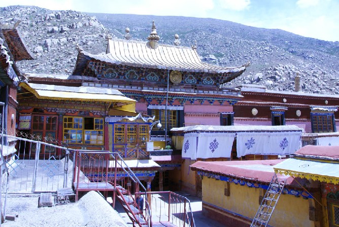 從拉薩市中心坐4路公交、出租車或者三輪車只能到山腳,然后要徒步30分鐘上山。寺廟每周三都有法事活動(dòng),眾喇嘛齊聚一堂念經(jīng),場(chǎng)面壯觀。
