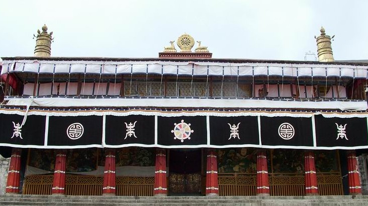 設(shè)甘珠爾拉康,藏《甘珠爾》經(jīng)。大殿3層是強(qiáng)巴佛(未來(lái)佛)殿。內(nèi)供強(qiáng)巴佛八歲時(shí)的等身巨形銅像。這尊強(qiáng)巴佛像是當(dāng)年宗喀巴在世的時(shí)候由他親自開光的,極為著名,亦名“強(qiáng)巴通真”。除了宗教的意義以外,它是西藏所有強(qiáng)巴佛里最通神的一尊,實(shí)在是西藏不可多得的藝術(shù)珍寶。強(qiáng)巴佛殿門上懸掛“穆隆元善”漢文匾額一方,是清朝時(shí)任駐藏大臣的琦善在他任滿調(diào)離西藏時(shí)(1846年)刻制奉獻(xiàn)的。大殿四樓是釋迦佛殿,據(jù)說是以500兩銀子制成,兩旁置銀塔13座。