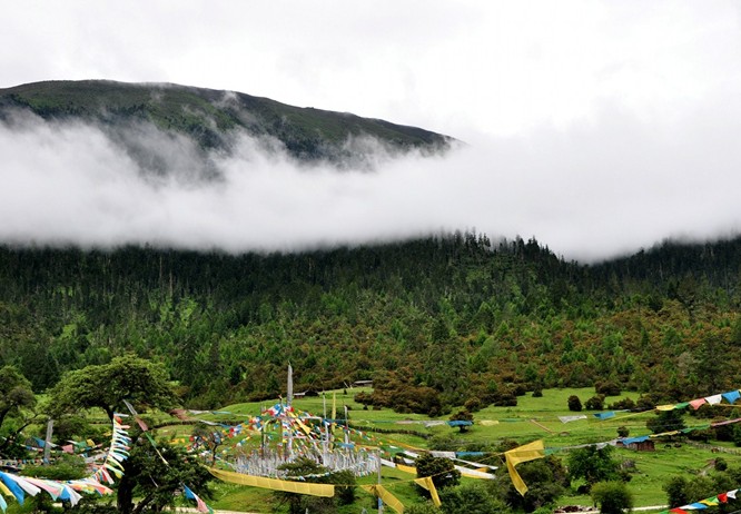 魯朗海拔3700米,位于距林芝地區(qū)八一鎮(zhèn)80公里左右的川藏路上,坐落在深山老林之中;這是一片典型高原山地草甸狹長(zhǎng)地帶,長(zhǎng)約15公里,平均寬約1公里。兩側(cè)青山由低往高分別由灌木叢和崐茂密的云杉和松樹(shù)組成“魯朗林海”;中間是整齊劃一的草甸,崐猶如人工整治一般;草甸中,溪流蜿蜒,泉水潺潺,草坪上報(bào)春崐花、紫苑花、草梅花、馬先蒿花等成千上萬(wàn)種野花怒放盛開(kāi),頗崐具林區(qū)特色的木籬笆、木板屋、木頭橋及農(nóng)牧民的村寨星落棋布、崐錯(cuò)落有秩,勾畫(huà)了一幅恬靜、優(yōu)美的“山居圖”。