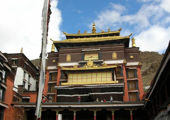 錯(cuò)欽大殿為該寺最早建筑。殿前有一500平方米的講經(jīng)場(chǎng),是班禪向全寺僧眾講經(jīng)和僧人辯經(jīng)的場(chǎng)所。大殿內(nèi)同時(shí)可容2000多人誦經(jīng)。供奉的佛像除釋迦牟尼佛及其大弟子外,兩邊柱上還刻有建寺人根敦主與四世班禪的立像;周圍有宗喀巴師徒和80位高僧造像等。