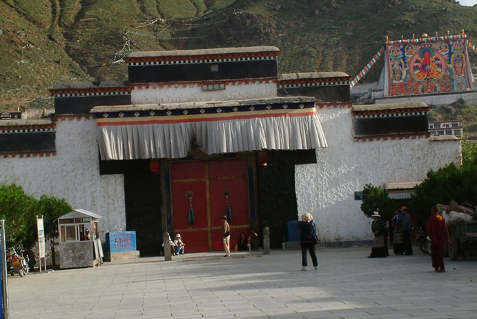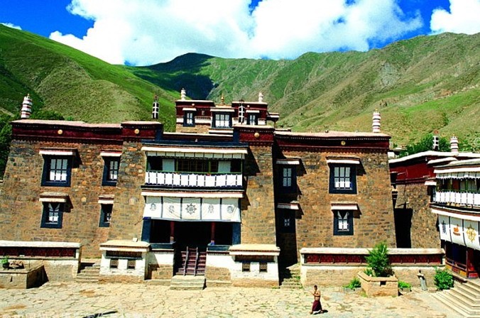 寺院坐西朝東,四面群山環(huán)抱,山清水秀,環(huán)境十分優(yōu)美。面積約10萬余平方米,圍墻為多邊形。寺內(nèi)主要建筑為祖拉康佛殿,坐西向東,高三層。底層為大經(jīng)堂,面闊5間,進(jìn)深6間,內(nèi)有20根方柱,其中有兩根高5.5米的林柱通向二層。