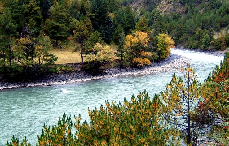 扎曲河谷風景奇特,春夏秋冬,兩岸風景隨四季變化,多姿多彩。春夏時節(jié),溝里綠樹遍野,蒼松古柏,傲然挺立,放眼望去,漫山皆綠,繁花爛漫,溝里到處芳香四溢,山上云蒸霞蔚,景色忽隱忽現(xiàn)。到處流水潺潺,山底江水清澈如綠帶,水波粼粼之間,有游魚嬉戲,讓人仿佛進入了夢幻境界。