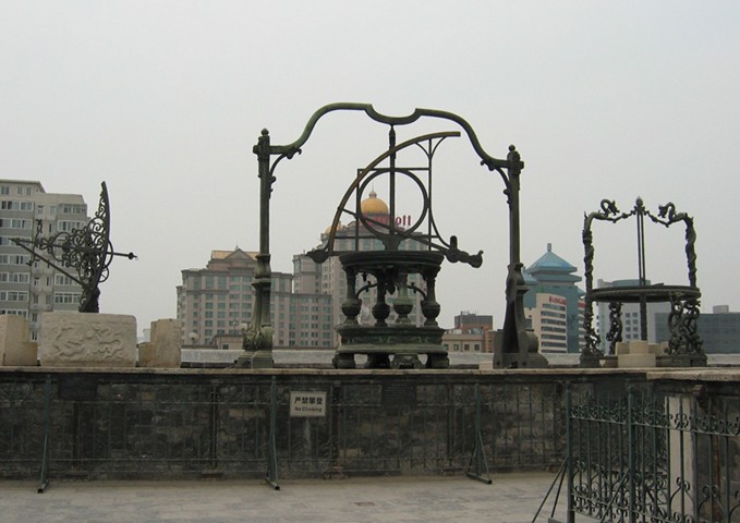 在明代,觀星臺(tái)上使用著明制渾儀、簡(jiǎn)儀、天體儀等大型儀器。清代康熙八年(1669年),比利時(shí)耶穌會(huì)傳教士南懷仁奉康熙帝之命,在前人的基礎(chǔ)上設(shè)計(jì)了六件新天文儀,至康熙十二年制成,計(jì)有:赤道經(jīng)緯儀、黃道經(jīng)緯儀、天體儀、地平經(jīng)儀、地平緯儀,紀(jì)限儀。新儀制成后,就將明代儀器全部移放臺(tái)下,將新制六件儀器安于臺(tái)上,進(jìn)行觀測(cè)??滴跷迨哪辏?715年),法國(guó)耶穌會(huì)傳教士紀(jì)理安設(shè)計(jì)的地平經(jīng)緯儀造成后安于臺(tái)上,這架儀器是地平經(jīng)儀、地平緯儀的合成,使用起來(lái)比較方便。但紀(jì)理安在監(jiān)制這架儀器時(shí),竟將臺(tái)下遺存的元明古儀充作廢銅使用,幸后來(lái)有人發(fā)現(xiàn)并奏明朝廷下令禁止,才保留了明制渾儀、簡(jiǎn)儀、天體儀三件(可惜,辛亥革命后,天體儀已不知去向)。這可以說(shuō)是北京古觀象臺(tái)上古代儀器的一大厄運(yùn)。