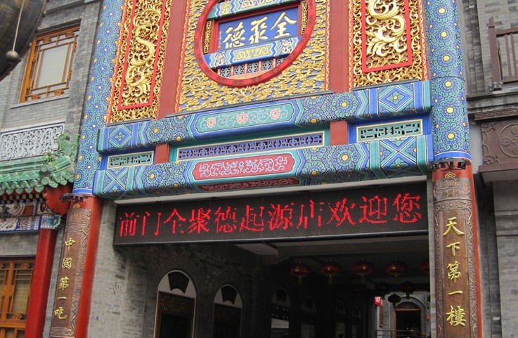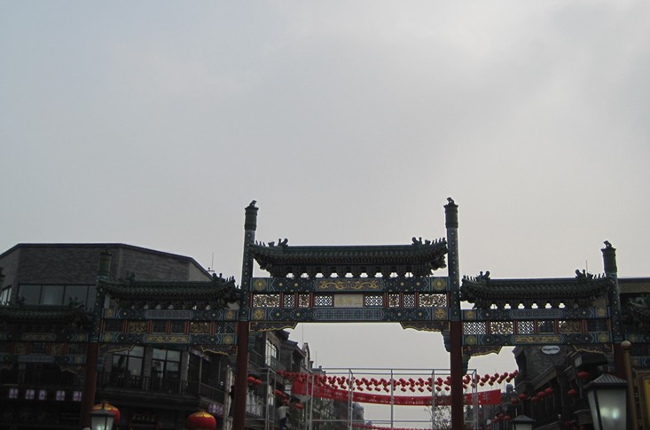 大柵欄是前門商業(yè)區(qū)的中心,泛指大柵欄街、廊房頭條、糧食店街和煤市街。明清時(shí)期入夜實(shí)行宵禁,在街頭巷尾設(shè)置柵欄,晝開夜閉,大柵欄因此得名。經(jīng)過近百年的發(fā)展,前門大柵欄集中了綢布店、藥店、鞋店、餐館等數(shù)百家店鋪和戲院。廊房頭條、廊房二條曾是珠寶玉器市場(chǎng);珠寶市街集中了二十九家官爐房,熔鑄銀元寶;錢市胡同、施家胡同、西沿河一帶開設(shè)了許多錢市利銀號(hào);而王廣福斜街、陜西巷等八條胡同則是妓院集中的地方,俗稱“八大胡同”。到1928年前門商業(yè)區(qū)開始走下坡路之前,大柵欄一帶一直是老北京的商賈繁華之地,許多著名的老字號(hào)就發(fā)源于此,比如全聚德烤鴨店、瑞蚨祥綢布店、同仁堂藥鋪、六必居醬菜園等,直到今天仍然長(zhǎng)盛不衰。