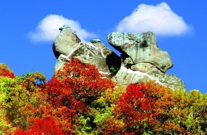 在白樺林附近,游路邊的山峰頂部,兩塊巨石狀如鴛鴦相依相偎。關于鴛鴦石,在當地還流傳著動人五岳寨-鴛鴦石的神話傳說。