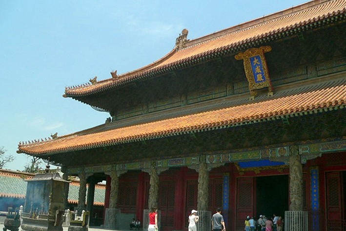 從杏壇北望,在雙層石欄的臺(tái)基上一座金黃色的大殿突兀凌空,雙重飛檐中海蘭色的豎匾上木刻貼金的群龍緊緊團(tuán)護(hù)著3個(gè)金色大字“大成殿”。字徑1米,是清雍正皇帝的手書(shū)。