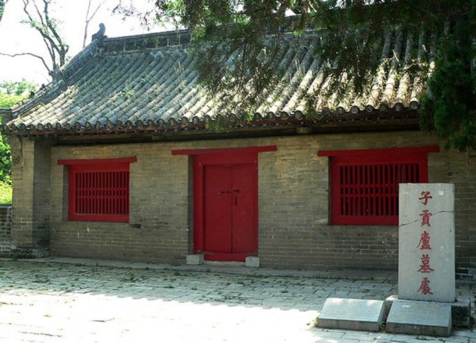 孔子墓西的3間西屋為子貢廬墓處??鬃铀篮?,眾弟子守墓3年,相訣而去,獨(dú)子貢在此又守3年。后人為紀(jì)念此事,建屋3間,立碑一座,題為“子貢廬墓處。”享殿之后,另有一座灰瓦攢尖頂?shù)姆酵?,稱“楷亭”。亭內(nèi)石碑上刻著一棵古老的楷樹(shù),即摹自其南側(cè)的“子貢手植楷”。相傳子貢奔喪來(lái)后,將一棵楷樹(shù)苗栽于其師墓旁,后成大樹(shù)。清康熙間遭雷火焚死,后人將枯干圖象刻于石上。