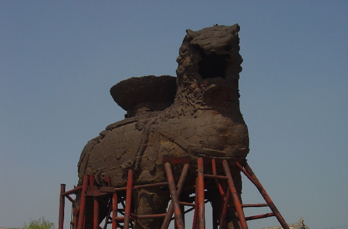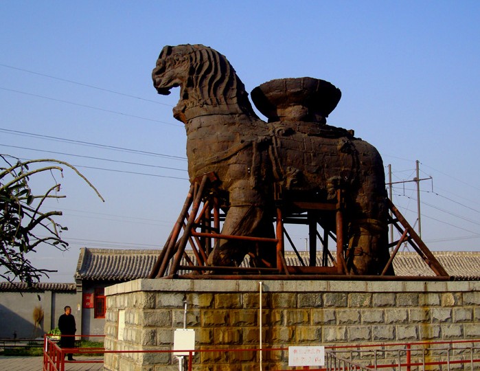 滄州鐵獅子位于滄州市政府駐地東南偏北16.5公里。坐落在東關村西0.5公里處。鐵獅身高5.78米,長5.34米,寬3.17米,體重約50噸。背負巨盆相傳是文殊菩薩蓮坐,獅身向南,頭向西南,兩左腳在前,兩右腳再后,呈前進狀,姿態(tài)雄偉,昂首闊步,徐徐如生鐵獅是我國大型的驚巧鑄鐵工藝。也是我國著名發(fā)源的古跡。