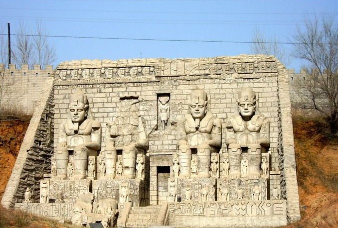 在埃及尼羅河西岸的峭壁上,雕鑿著四尊巨大的坐像,這四尊坐像均是古埃及第19王朝法老拉美西斯二世的雕像,每尊坐像高20米,其中一尊在戰(zhàn)爭中遭到破壞。門口上端雕刻的立像是太陽神,這是炫耀法老巨大權(quán)力的紀(jì)念性雕刻,臉部屬于肖像雕刻,具有寫實(shí)的特點(diǎn)。在尼羅河上航行可以看到這些巨人,并給人留下法老具有強(qiáng)大威力的難忘印象。坐像下面那些較小的雕像是法老的皇族。它建于公元前1275年。